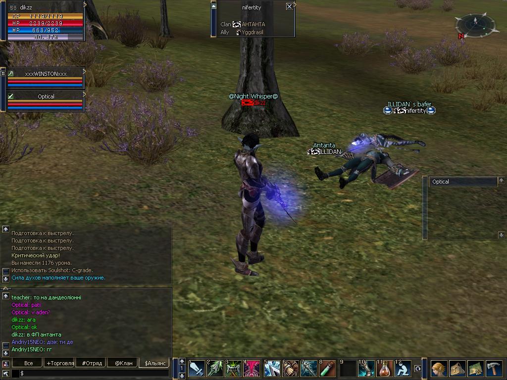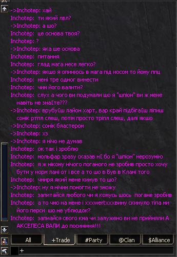 | Ну ви і даєте Вдарити в спину, Вдарили коли перс зявляєтесь з телепорту А потім один одному розказуєте і хвалитесь, що ви перемогли в чесному бою!!! А Іллідан, памятаєш мене Ну скільки раз ти мене тоді кільнув? Скажи А тепер скажи скільки раз ти мене кільнув в чесному бою? А скажи своїм однокланівцям, скільки раз я тебе кільнув? І чи не чекав я встороні поки ти зявишся, порегенишся, і бафанешся? І ішов в атаку тоді, коли ти починав свою атаку? Ну скажи? А я зроблю про тебе висновок. Ти кажеш що я криса? Бо тебе потім хтось кільнув з скорпів. Так-от я його не кликав, якби я когось покликав, то зразу , а не пів-години по тому як ми розійшлись!!!! Я слухаю Іллідан, що скажеш, хто ти? герой чи криса?